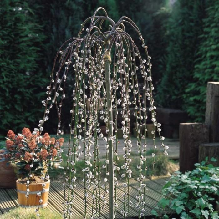 “Kilmarnock” is a small, stiff, pendulous tree with yellowish branches with ovate leaves. It also has large, grey catkins with yellow anthers that open before the leaves.