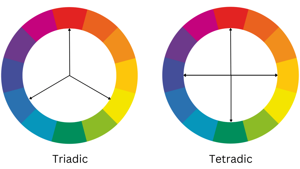 Tetradic schemes use four colours that are evenly spaced apart. They are daring, and they work best when one colour takes center stage and the others serve as accents. Balance becomes harder to achieve the more colours in your palette.