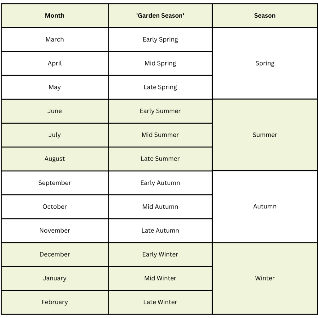 Gardening seasons refer to different periods throughout the year characterised by specific weather conditions and the corresponding tasks and activities that gardeners should focus on during those times. Understanding the gardening seasons helps gardeners plan and execute their gardening tasks effectively. Here’s a breakdown of the different gardening seasons based on the structure you provided:
