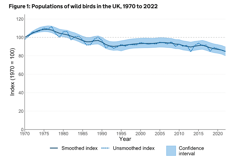 The chart above indicates a broad decline in wild bird populations of 15% since 1970. Woodland birds that often populate gardens have declined by 37%.